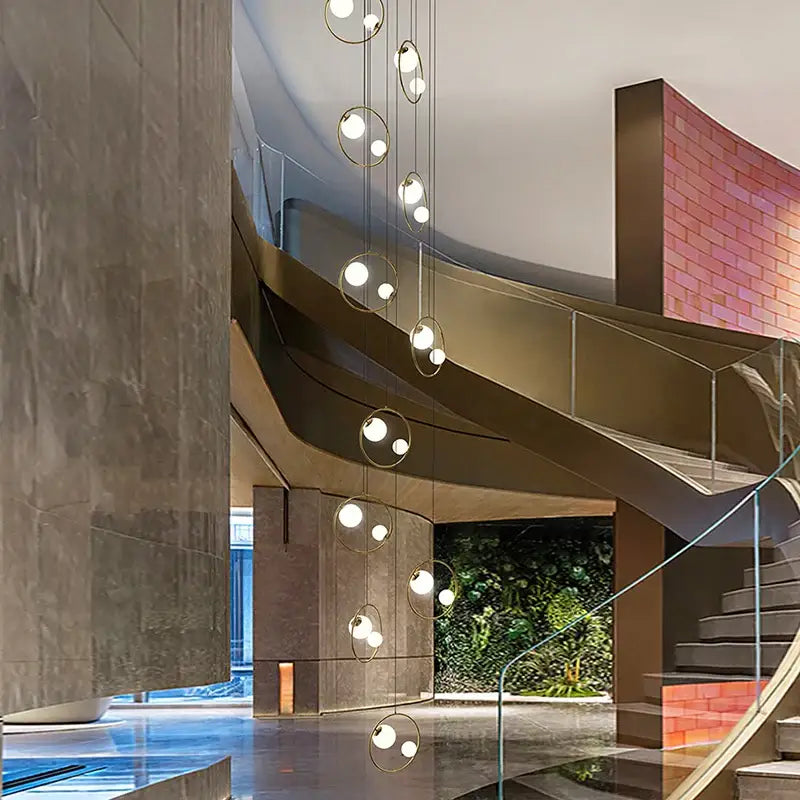 Installez une atmosphère élégante et chaleureuse avec cette suspension en cascade, une véritable sculpture lumineuse qui sublime vos espaces de vie. Chaque sphère ajourée en finition dorée diffuse une lumière douce, créant une ambiance raffinée et invitante. Plus qu’un simple luminaire, elle devient une signature décorative, apportant une touche d’exception et de poésie à votre intérieur, qu’il s’agisse d’un salon, d’une salle à manger ou d’un hall d’entrée.